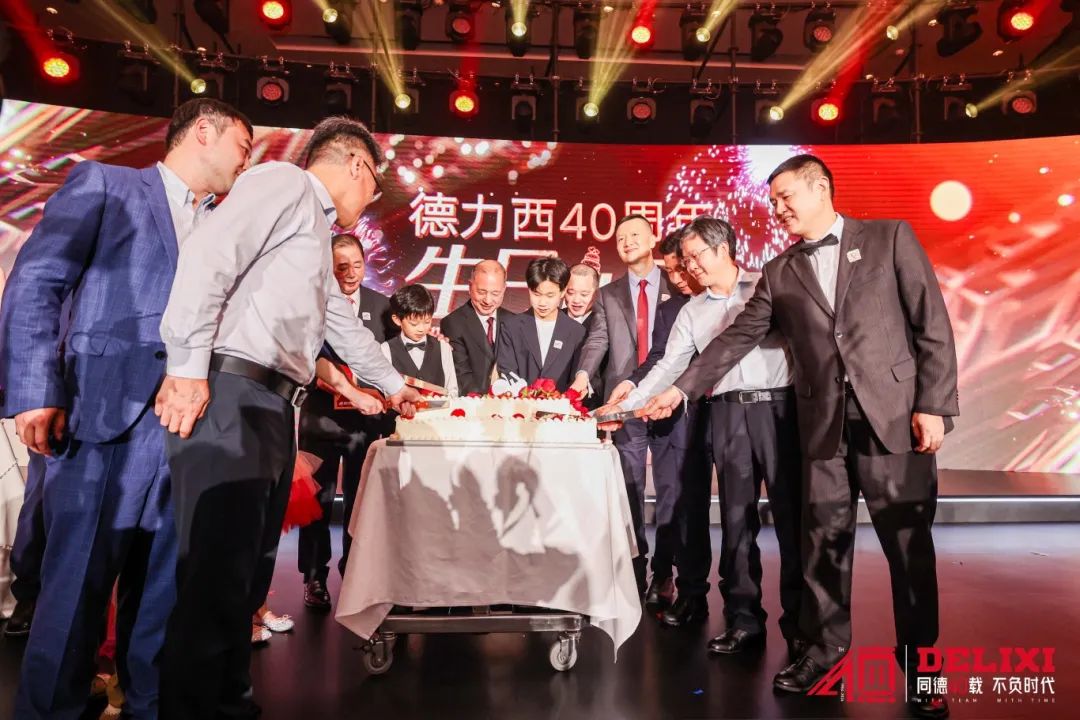 在兩位創(chuàng)始人的見證下,集團(tuán)與各一級(jí)企業(yè)的代表——胡煜鐄、樓峰、張永、包秀杰以及上海德力西集團(tuán)總裁胡涉琪、甘化科工總裁李忠、德新科技董事長邱嶺、資產(chǎn)集團(tuán)總裁宣剛、上德環(huán)??偛糜谘蠊餐虚_德力西40歲的生日蛋糕。