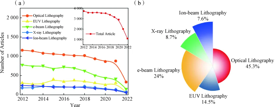 1 不同光刻技術(shù)相關(guān)的公開發(fā)表論文數(shù)量變化趨勢和占比