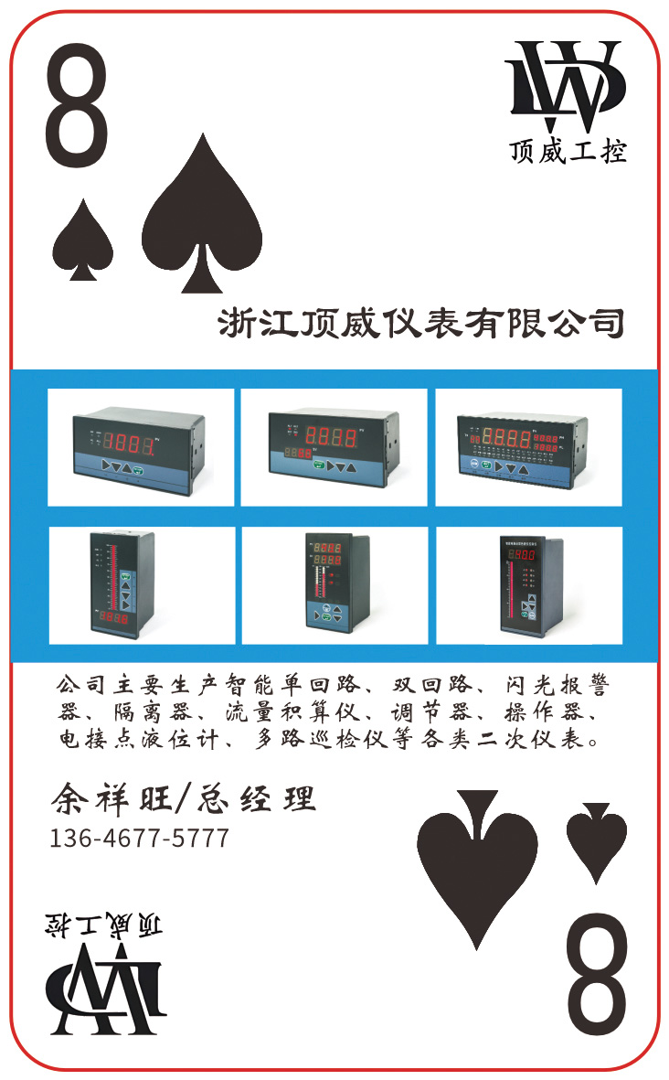 在當(dāng)今充滿機遇與挑戰(zhàn)的時代,儀表行業(yè)正經(jīng)歷著深刻的變革與發(fā)展。圖頁網(wǎng)發(fā)起的《2025 圖頁網(wǎng)儀表行業(yè)摜蛋撲克牌》活動,為行業(yè)內(nèi)的企業(yè)搭建起了一個獨特的交流與合作平臺。在這場別開生面的活動中,浙江頂威儀表有限公司積極參與,認(rèn)領(lǐng)了黑桃 8 作為專屬牌,展現(xiàn)出了公司對行業(yè)發(fā)展的深刻理解和積極態(tài)度。