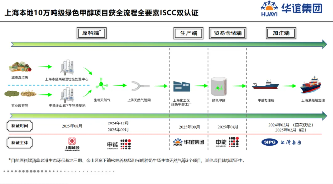 項(xiàng)目由申能集團(tuán)、上海城投集團(tuán)、華誼集團(tuán)和上港集團(tuán)等四家市屬國企攜手合作。項(xiàng)目目前獲得的11張認(rèn)證證書涵蓋了申能集團(tuán)位于金山區(qū)廊下鎮(zhèn)生物質(zhì)基地和城投集團(tuán)位于老港生態(tài)環(huán)保基地的綠色甲醇原料端、華誼集團(tuán)綠色甲醇生產(chǎn)端,以及申能集團(tuán)和上港集團(tuán)綠色甲醇貿(mào)易、倉儲和加注端,標(biāo)志著上海本地10萬噸級綠色甲醇項(xiàng)目取得了進(jìn)入全球市場并于上海港進(jìn)行加注的綠色通行證