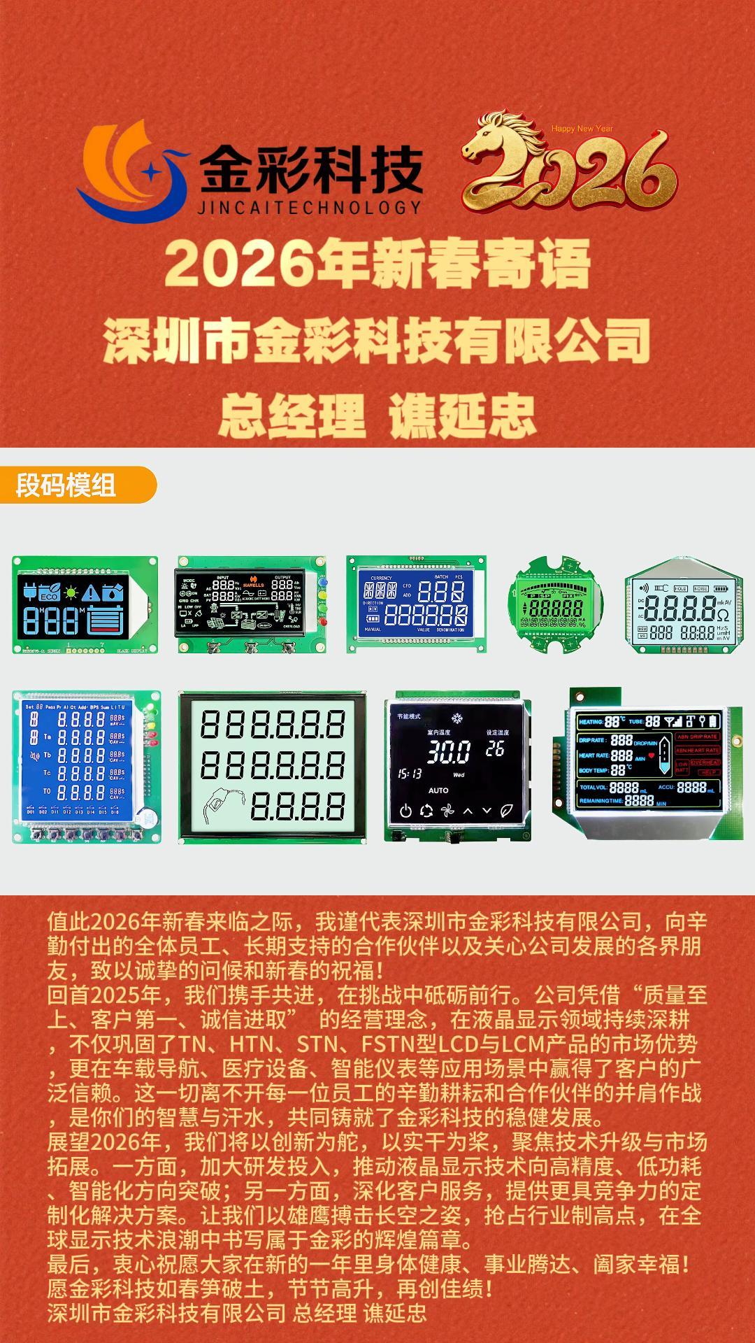 回首2025年,我們攜手共進(jìn),在挑戰(zhàn)中砥礪前行。公司憑借“質(zhì)量至上、客戶第一、誠信進(jìn)取” 的經(jīng)營理念,在液晶顯示領(lǐng)域持續(xù)深耕,不僅鞏固了TN、HTN、STN、FSTN型LCD與LCM產(chǎn)品的市場優(yōu)勢,更在車載導(dǎo)航、醫(yī)療設(shè)備、智能儀表等應(yīng)用場景中贏得了客戶的廣泛信賴。這一切離不開每一位員工的辛勤耕耘和合作伙伴的并肩作戰(zhàn),是你們的智慧與汗水,共同鑄就了金彩科技的穩(wěn)健發(fā)展。
