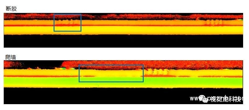 斷膠:當出現(xiàn)斷膠物料時,點膠膠路上沒有膠水,此時無膠水的部分與有膠水的部分出現(xiàn)較大高度差。