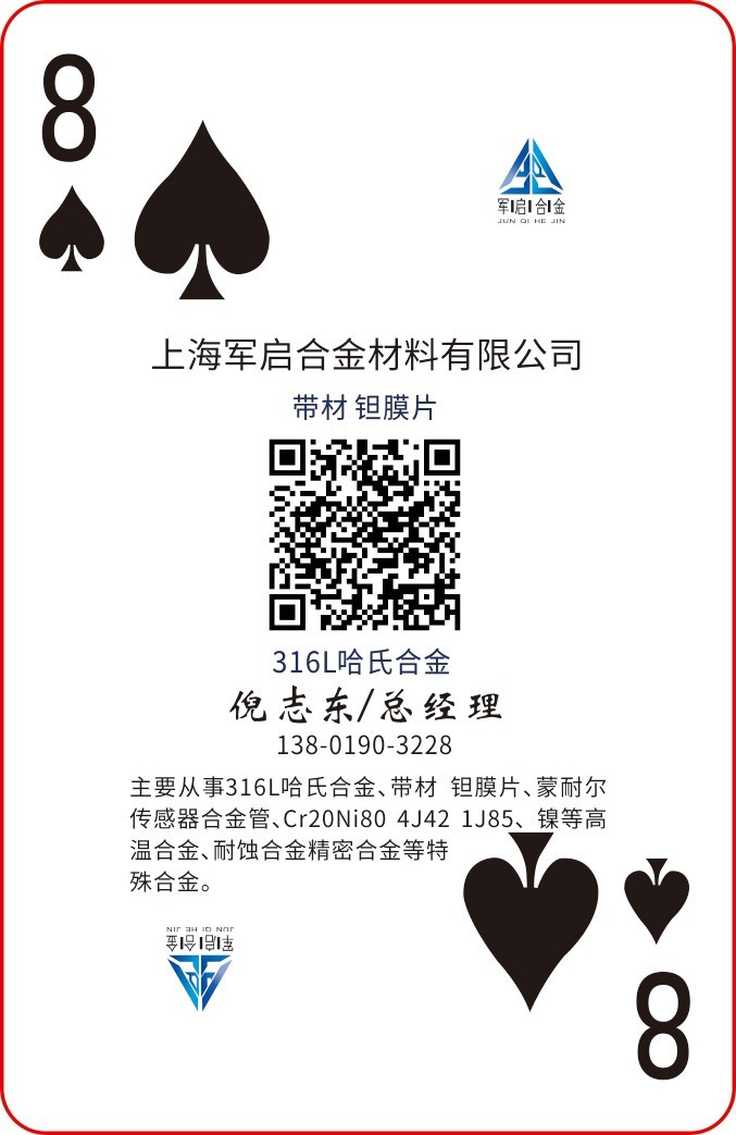 《2020圖頁儀表行業(yè)撲克牌》推出就得到 上海軍啟合金材料有限公司總經(jīng)理倪志東認同和支持,倪總的軍啟合金材料積極認領(lǐng)了黑桃8做為此次的公司專屬牌!