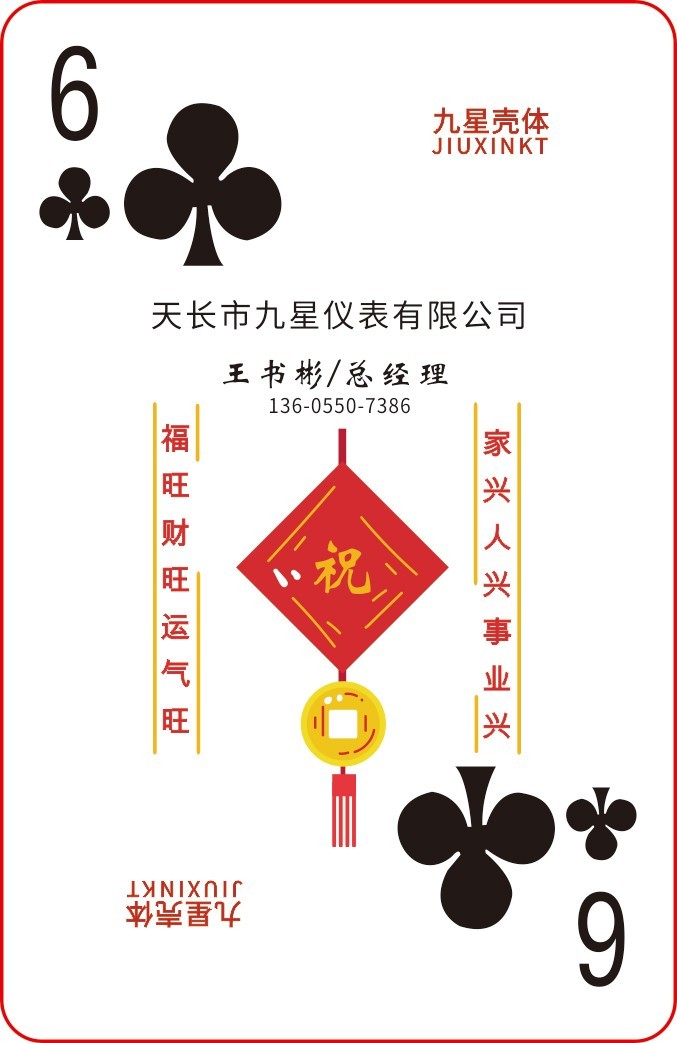 《2020圖頁儀表行業(yè)撲克牌》推出就得到天長市九星儀表有限公司總經(jīng)理王書彬的認同和支持,王總的九星儀表積極認領(lǐng)了梅花6做為此次的公司的專屬牌!