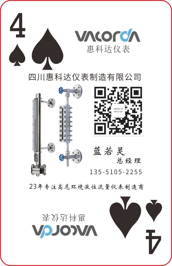 《2020圖頁儀表行業(yè)撲克牌》推出就得到 四川惠科達(dá)儀表制造有限公司總經(jīng)理藍(lán)若靈的認(rèn)同和支持,藍(lán)總的惠科達(dá)儀表積極認(rèn)領(lǐng)了黑桃4作為此次的公司的專屬牌!