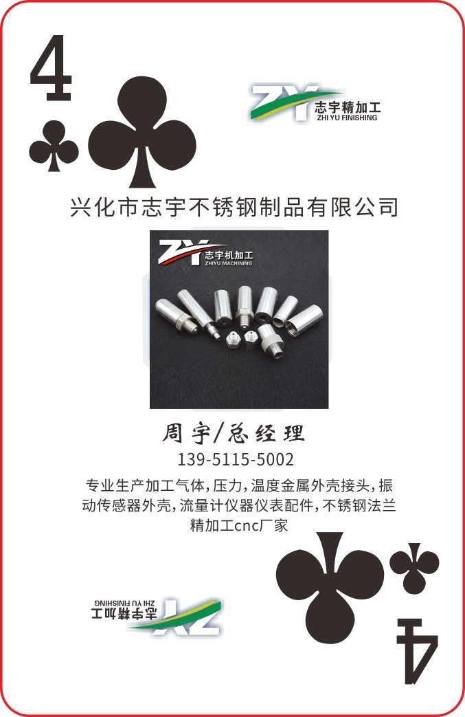 《2020圖頁儀表行業(yè)撲克牌》推出就得到 興化市志宇不銹鋼制品有限公司總經理周宇的認同和支持,周總的志宇不銹鋼制品積極認領了梅花4做為此次的公司的專屬牌!