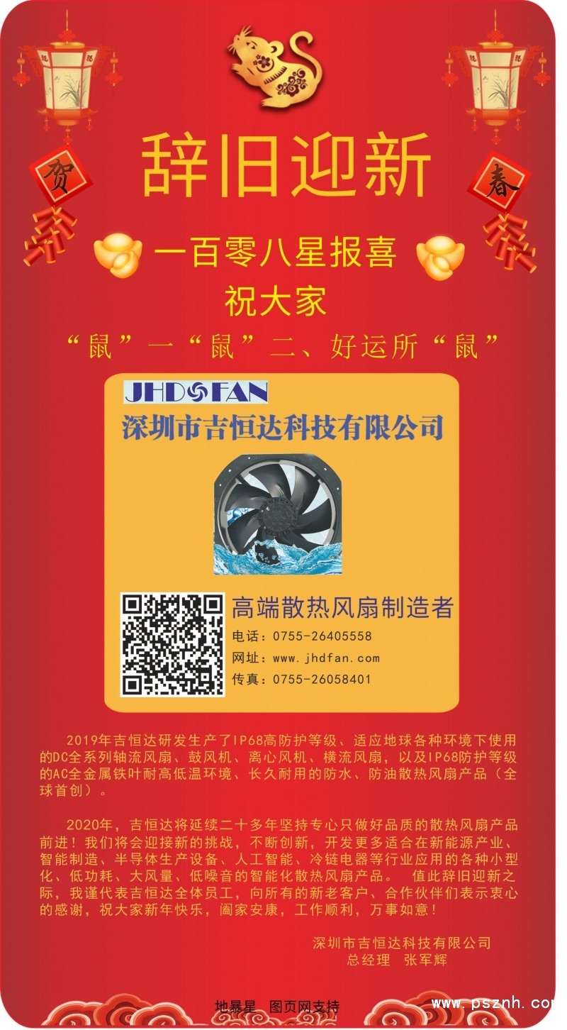 2020年,吉恒達(dá)將延續(xù)二十多年堅(jiān)持專心只做好品質(zhì)的散熱風(fēng)扇產(chǎn)品前進(jìn)!我們將會(huì)迎接新的挑戰(zhàn),不斷創(chuàng)新,開(kāi)發(fā)更多適合在新能源產(chǎn)業(yè)、智能制造、半導(dǎo)體生產(chǎn)設(shè)備、人工智能、冷鏈電器等行業(yè)應(yīng)用的各種小型化、低功耗、大風(fēng)量、低噪音的智能化散熱風(fēng)扇產(chǎn)品。  值此辭舊迎新之際,我謹(jǐn)代表吉恒達(dá)全體員工,向所有的新老客戶、合作伙伴們表示衷心的感謝,祝大家新年快樂(lè),闔家安康,工作順利,萬(wàn)事如意!