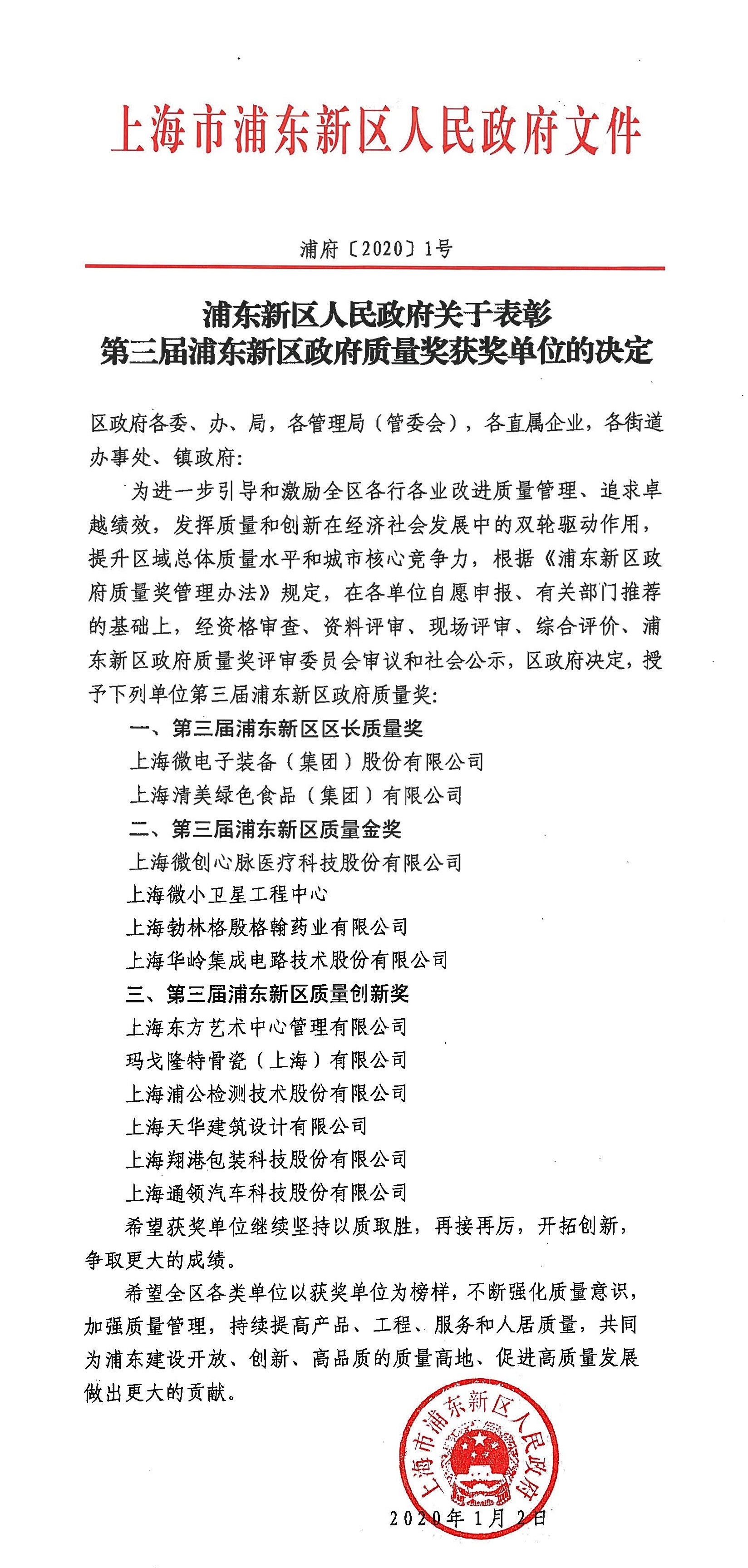 上海微電子裝備榮獲“第三屆浦東新區(qū)區(qū)長質(zhì)量獎”