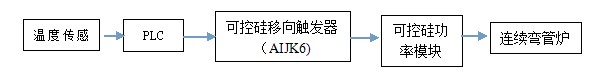 溫度傳感器測(cè)出連續(xù)彎管爐內(nèi)的實(shí)時(shí)溫度后給PLC,與PLC的設(shè)定值比較后輸出一個(gè)4-20mA的電流信號(hào)給可控硅移向觸發(fā)器,可控硅移向觸發(fā)器輸出觸發(fā)信號(hào)給可控硅功率模塊從而精確控制連續(xù)彎管爐內(nèi)的溫度。