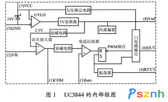 5腳和7腳是供電GND和VCC端子,UC3844具有16V起振電壓和10V欠壓鎖定電壓,不同于UC3843的8.5V起振電壓和7.6V的欠壓鎖定電壓。UC3844正常工作電壓在10~17V之間。