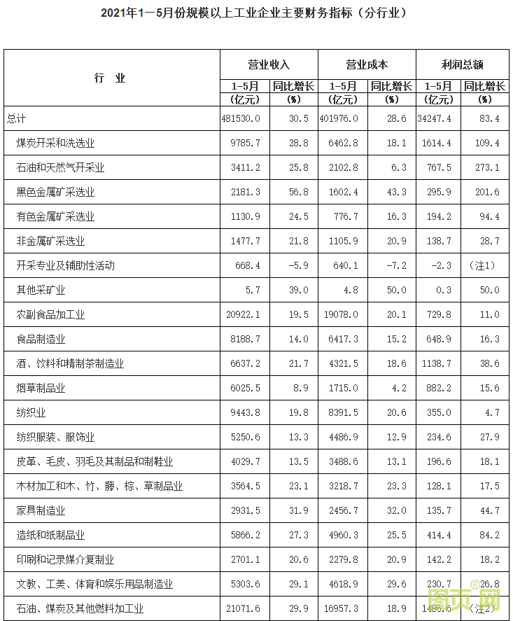 1-5月份,采礦業(yè)實(shí)現(xiàn)利潤(rùn)總額3008.7億元,同比增長(zhǎng)1.36倍;制造業(yè)實(shí)現(xiàn)利潤(rùn)總額29006.6億元,增長(zhǎng)85.2%;電力、熱力、燃?xì)饧八a(chǎn)和供應(yīng)業(yè)實(shí)現(xiàn)利潤(rùn)總額2232.1億元,增長(zhǎng)29.1%。