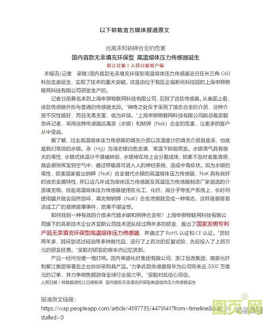 轉《人民日報》客戶端報道:國內首款無汞填充環(huán)保型高溫熔體壓力傳感器誕生