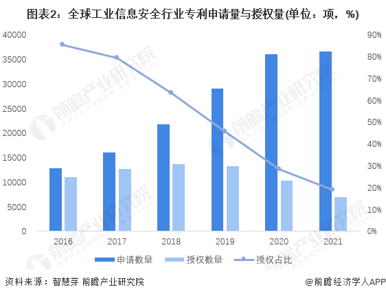 截至2022年6月23日,全球工業(yè)信息安全行業(yè)專(zhuān)利年授權(quán)數(shù)量為6923項(xiàng),授權(quán)比重為18.97%,較2020年末進(jìn)一步下降。