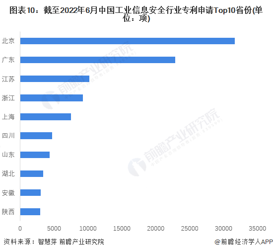 從我國(guó)工業(yè)信息安全行業(yè)專(zhuān)利申請(qǐng)數(shù)量的省份分布來(lái)看,北京省工業(yè)信息安全相關(guān)專(zhuān)利的申請(qǐng)數(shù)量最多,截至2022年6月23日,共計(jì)申請(qǐng)31676項(xiàng);其次是廣東省,共計(jì)申請(qǐng)22867項(xiàng)。