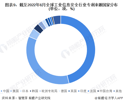 目前,全球工業(yè)信息安全行業(yè)第一大技術(shù)來(lái)源國(guó)是中國(guó),截止2022年6月23日,中國(guó)工業(yè)信息安全相關(guān)專(zhuān)利數(shù)量為145373項(xiàng),占全球工業(yè)信息安全專(zhuān)利數(shù)量的46.09%。