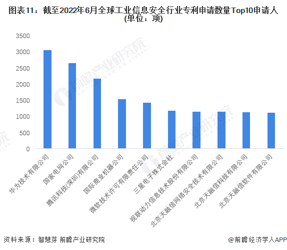 全球工業(yè)信息安全行業(yè)專(zhuān)利申請(qǐng)數(shù)量TOP10申請(qǐng)人分別是華為技術(shù)有限公司、國(guó)家電網(wǎng)公司、騰訊科技(深圳)有限公司、國(guó)際商業(yè)機(jī)器公司、微軟技術(shù)許可有限責(zé)任公司、三星電子株式會(huì)社、視聯(lián)動(dòng)力信息技術(shù)股份有限公司、北京天融信網(wǎng)絡(luò)安全技術(shù)有限公司、北京天融信科技有限公司和北京天融信軟件有限公司。