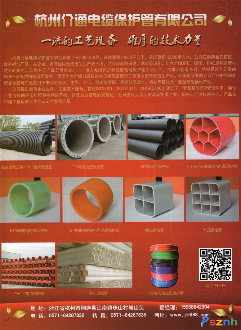 杭州介通電纜保護(hù)管有限公司_玻璃鋼管_PVC-C高壓埋地式電纜保護(hù)管_MPP非開(kāi)挖/埋地式電力排管_大口徑高密度聚乙烯排水塑料管道_HDPE纏繞結(jié)構(gòu)壁增強(qiáng)管材