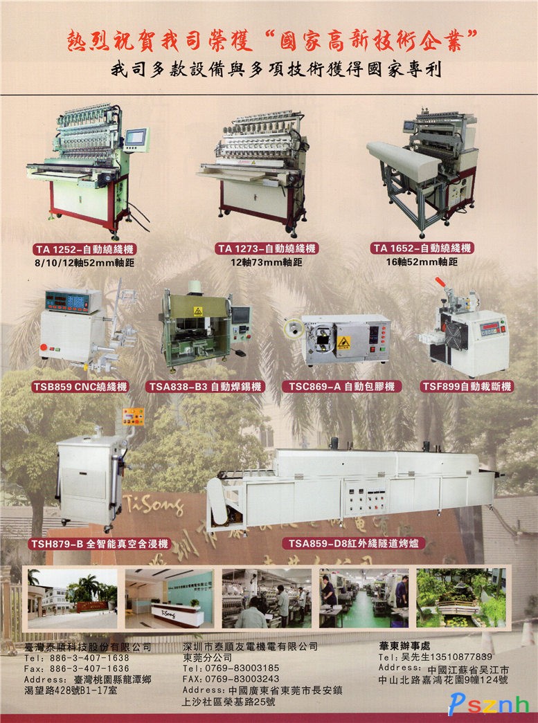 泰順公司擁有變壓器整廠設(shè)備的研發(fā)及生產(chǎn)優(yōu)勢(shì),有別于業(yè)界的眾多設(shè)備拼裝廠商,泰順公司有全自動(dòng)化生產(chǎn)線、全自動(dòng)繞線機(jī)、全自動(dòng)焊錫機(jī)、全自動(dòng)包膠機(jī)、CNC繞線機(jī)、CNC焊錫機(jī)、CNC包膠機(jī)、真空含浸機(jī)、烘烤設(shè)備,等,可為客戶提供整廠配套方案并幫助客戶不斷提高自動(dòng)化水準(zhǔn)。
