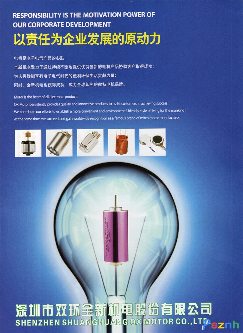 深圳市雙環(huán)全新機電股份有限公司是一個全球范圍內(nèi)的高精密電機產(chǎn)品的專業(yè)制造商,18年以來,不斷致力于速度、創(chuàng)新、品質(zhì)、成本、規(guī)模的經(jīng)營理念,使得全新機電飛速發(fā)展,成為客戶信賴的合作伙伴。 深圳市雙環(huán)全新機電股份有限公司是一家準備上市的國家高新技術(shù)企業(yè),總部位于中國深圳,員工超過4000人,在深圳、湖南設(shè)有二大生產(chǎn)基地,總面積超過5萬平方米,具有1億臺的年生產(chǎn)能力。全新機電將10億計的電機產(chǎn)品提供至全球各地,并被使用在移動電話、玩具、電動工具、精密儀器、機器人、柜員機、軍工產(chǎn)品等近百種不同的應(yīng)用之上。公司主要產(chǎn)品為空心杯電機、鐵芯電機、無刷電機、振動電機。我們依賴先進的生產(chǎn)設(shè)備及精密的檢驗實驗設(shè)備,輔以客戶為中心的銷售服務(wù)體系,使高速、高品質(zhì)、低成本、規(guī)?;貪M足客戶要求成為可能,協(xié)助客戶取得成功。 深圳市雙環(huán)全新機電股份有限公司以責任為企業(yè)發(fā)展的原動力。對產(chǎn)品、對客戶、對員工、對股東、對供應(yīng)商、對環(huán)境、對社會的責任,促使我們不斷奮發(fā),追求理想?,F(xiàn)在各類工程技術(shù)人員占管理人員總數(shù)的60%以上,每年研究、開發(fā)、技改費用占銷售額的7%左右,正因如此,空心杯電機從Ф10mm到Ф4mm,從17mm長到10mm長的每一次向更短、更小方向發(fā)展的趨勢都和國外著名廠家同步。 正是堅持不懈的采用新技術(shù)、新工藝,我們的綜合性價比在國內(nèi)同行中領(lǐng)先,1998年公司通過英國AOQC ISO9001質(zhì)量體系認證,又使我們“產(chǎn)品質(zhì)量是我們的追求、客戶滿意是我們承諾”有了切實保障,從而使公司從成立以來銷售額每年保持50%以上的增長,產(chǎn)品進入了國內(nèi)外手機生產(chǎn)廠。 深圳市雙環(huán)全新機電股份有限公司的產(chǎn)品能滿足各種領(lǐng)域的應(yīng)用要求。我們有足夠的電機設(shè)計及應(yīng)用的專業(yè)能力和豐富經(jīng)驗。我們想客戶之所想,理解客戶對產(chǎn)品性能、成本、可靠性、批量生產(chǎn)、包裝、運輸、環(huán)境等方面的所有要求。在這種理解的基礎(chǔ)上,我們與客戶的設(shè)計團隊協(xié)力合作設(shè)計出完美的電機解決方案。 深圳市雙環(huán)全新機電股份有限公司投入了大量的時間和資源建設(shè)專業(yè)研究團隊,建設(shè)先進的實驗室,建立高于業(yè)界標準的嚴格的開發(fā)和測試流程,應(yīng)用現(xiàn)代的計算機輔助設(shè)計工具(CAD)和產(chǎn)品數(shù)據(jù)管理工具(PDM),這使得我們開發(fā)產(chǎn)品的速度、可靠性、應(yīng)用性、成本合理性得到根本保證。同時,我們始終致力于改進相關(guān)的技能、技術(shù)、流程和設(shè)備,深圳市雙環(huán)全新機電股份有限公司因此而保持領(lǐng)先。