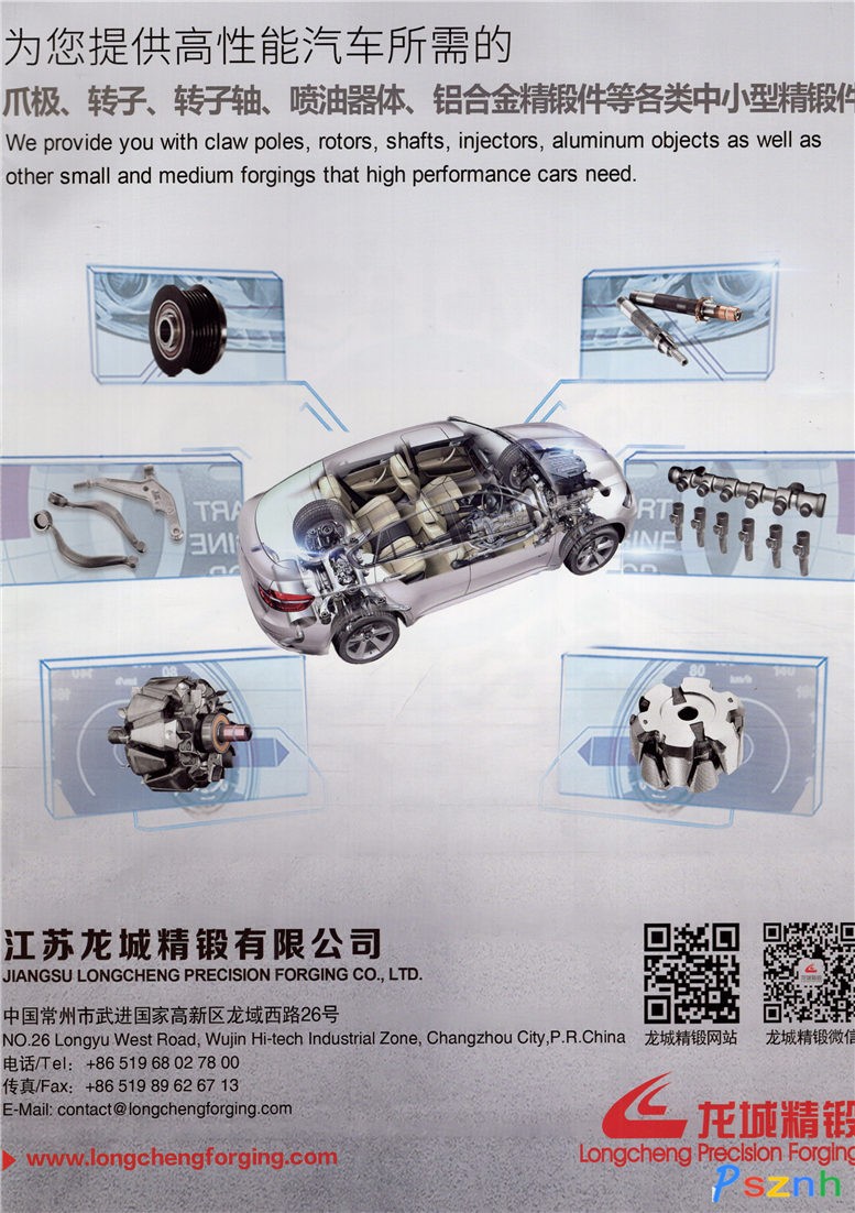 江蘇龍城精鍛有限公司位于江蘇常州武進國家高新技術開發(fā)區(qū)。占地面積共17萬平方米,固定資產9億余元,員工1600多人,其中各類專業(yè)技術人員300余人;目前是全世界首屈一指的小型精鍛件制造商,全球最大的汽車發(fā)電機精鍛爪極專業(yè)制造商之一。