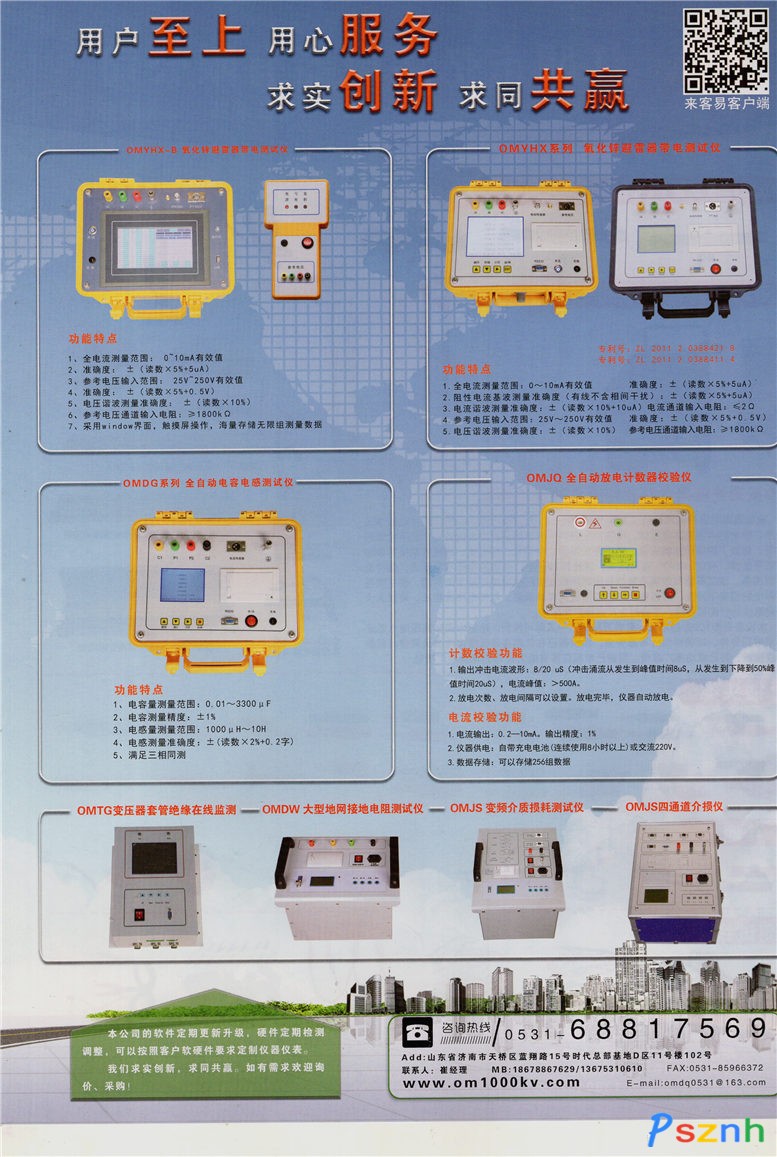濟南歐姆電氣設(shè)備有限公司,簡稱:歐姆電氣。是一家專注于電力系統(tǒng)高壓試驗設(shè)備和在線監(jiān)測類儀器儀表生產(chǎn)的研發(fā)型企業(yè)。從2007年開始,公司專注于高壓檢測類儀器儀表研發(fā),主要為國內(nèi)知名企業(yè)從事OEM工作。2011年,公司借助自身先進(jìn)的技術(shù)力量和豐富的OEM經(jīng)驗,以高壓檢測設(shè)備生產(chǎn)為依托,以合作研發(fā)在線監(jiān)測類產(chǎn)品為契機,以嶄新的形象矗立于我國東方名城:泉城。目前,經(jīng)公司研發(fā)并且熱銷的產(chǎn)品有全自動精密介損測試儀,交直兩用型免拆線電容電感測試儀,無線傳輸型氧化鋅避雷器測試儀、異頻抗干擾大地網(wǎng)阻抗測試儀、5000V水內(nèi)冷兆歐表、智能型直流高壓發(fā)生器、容性設(shè)備在線測試儀、變壓器套管介損在線監(jiān)測、變壓器鐵芯接地在線監(jiān)測等。