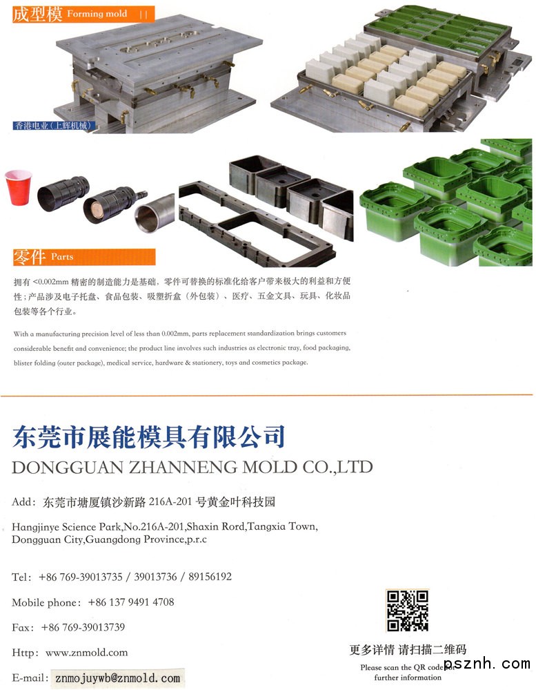 東莞市展能模具有限公司,位于東莞市塘廈鎮(zhèn),是一家針對(duì)包裝行業(yè),制作各類吸塑包裝熱成型模具的廠家。專業(yè)研究、設(shè)計(jì)、制造熱成型模具,適用于:德國(guó)ILLIG、KIEFEL,日本淺野機(jī)械A(chǔ)SANO、LAB,臺(tái)灣承美機(jī)械HYTEK、臺(tái)灣矗霖CHULIING、中國(guó)汕頭凹凸機(jī)械A(chǔ)UTO、中國(guó)汕頭盟星機(jī)械、中國(guó)汕頭達(dá)誠機(jī)械、中國(guó)香港電業(yè)(上輝機(jī)械)。產(chǎn)品涉及電子托盤、食品包裝、吸塑折盒(外包裝)、醫(yī)療、五金文具、玩具、化妝品包裝等各個(gè)行業(yè)。
