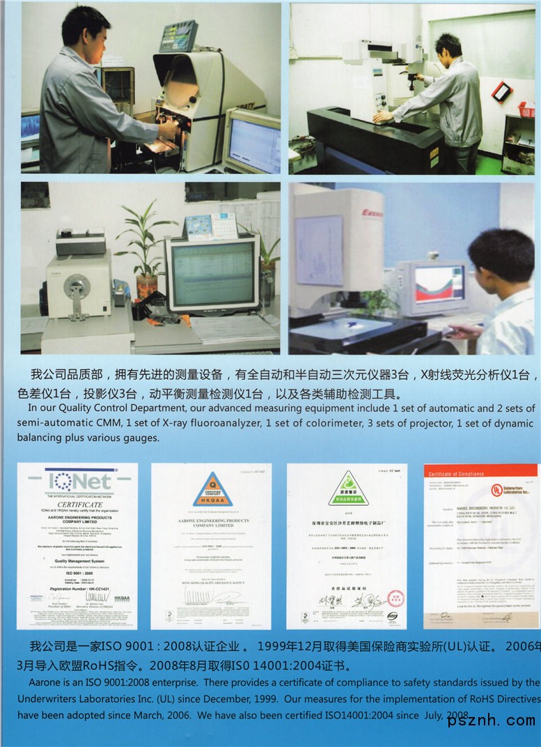 藝群實業(yè)有限公司于1983年八月成立于香港, 1991年在深圳市寶安區(qū)沙井鎮(zhèn)建立工廠,是一家提供家用電器和電子產(chǎn)品之注塑模具及塑膠件、注塑成型加工服務(wù)、塑膠工模制造、絲印、噴涂及裝配的港資企業(yè)。 公司廠房占地面積15000平方米,擁有員工600多名,其中辦公室由人力資源部、會計部、采購部、工程部、PMC部、開發(fā)部、文控中心及計算機部等組成;車間組合有注塑部、工模部、修模部、PE部、絲印部、色粉部、質(zhì)量部、裝配生產(chǎn)部及倉庫。 藝群是一家ISO9001:2000認證企業(yè)。1999年12月取得美國保險商實驗所(UL)認證。2006年3月導(dǎo)入歐盟RoHS指令。2008年7月通過ISO14001:2004 審核。 |