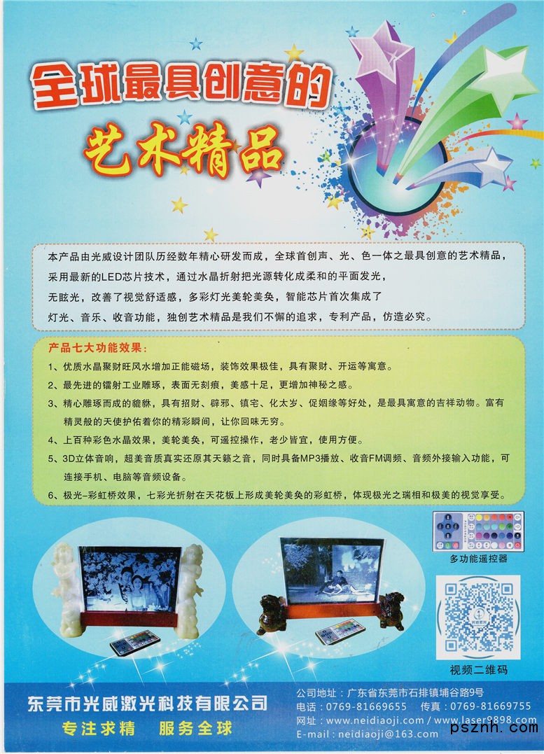 東莞市光威激光科技公司,打破常規(guī),突破內(nèi)雕禮品行業(yè)應(yīng)用局限,始終如一的專(zhuān)注工業(yè)激光應(yīng)用,憑著精湛的技術(shù)和嚴(yán)格的管理,秉誠(chéng)“專(zhuān)業(yè)服務(wù),專(zhuān)注求精”的經(jīng)營(yíng)理念,目前已經(jīng)成為工業(yè)內(nèi)雕應(yīng)用的領(lǐng)航者!目前給飛利浦、創(chuàng)維、格力、TCL、魅族、勁勝股份、步步高、新銳股份、雷士照明、華裕燈飾、萬(wàn)德集團(tuán)、惠妮集團(tuán)、方正等國(guó)內(nèi)外多家知名企業(yè)提供內(nèi)雕技術(shù)支持,開(kāi)發(fā)多款新設(shè)備新產(chǎn)品!特別是亞克力內(nèi)雕的效果,能與水晶媲美(潔白、精細(xì)),多次受到國(guó)內(nèi)外權(quán)威專(zhuān)家的肯定和支持!
