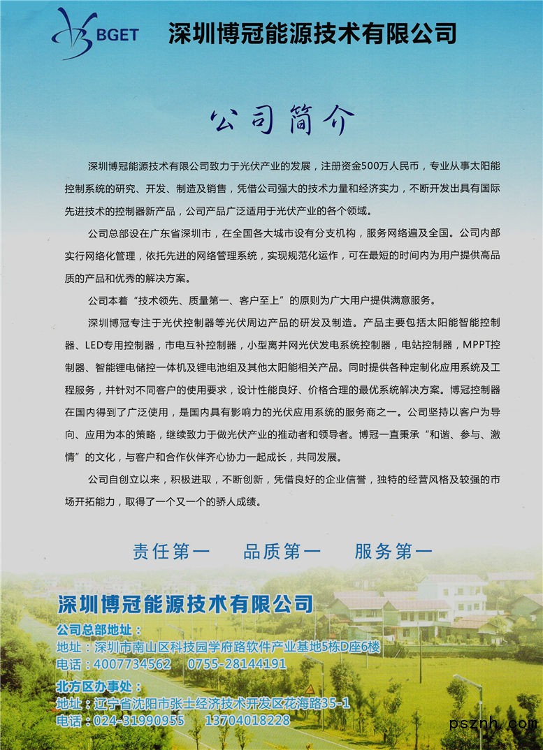 深圳博冠能源技術(shù)有限公司專注于光伏光伏控制器等光伏周邊產(chǎn)品的研發(fā)與制造。產(chǎn)品主要包括太陽能智能控制器、LED專用控制器,市電互補(bǔ)控制器,小型離并網(wǎng)光伏發(fā)電系統(tǒng)控制器,電站控制器,MPPT控制器及其他太陽能相關(guān)產(chǎn)品。同時(shí),提供各種定制化應(yīng)用系統(tǒng)及工程服務(wù)。并針對不同客戶的使用要求設(shè)計(jì)性能良好、價(jià)格合理的最優(yōu)系統(tǒng)解決方案,博冠控制器在國內(nèi)得到了廣泛使用,是國內(nèi)具影響力的光伏應(yīng)用系統(tǒng)的服務(wù)商商之一。公司將堅(jiān)持以客戶導(dǎo)向、應(yīng)用為本的策略,繼續(xù)專注于在光伏產(chǎn)業(yè)的推動者和服務(wù)者。博冠將秉承"和諧、參與、激情"的文化,與客戶和合作伙伴齊心協(xié)力一起成長,共同發(fā)展。