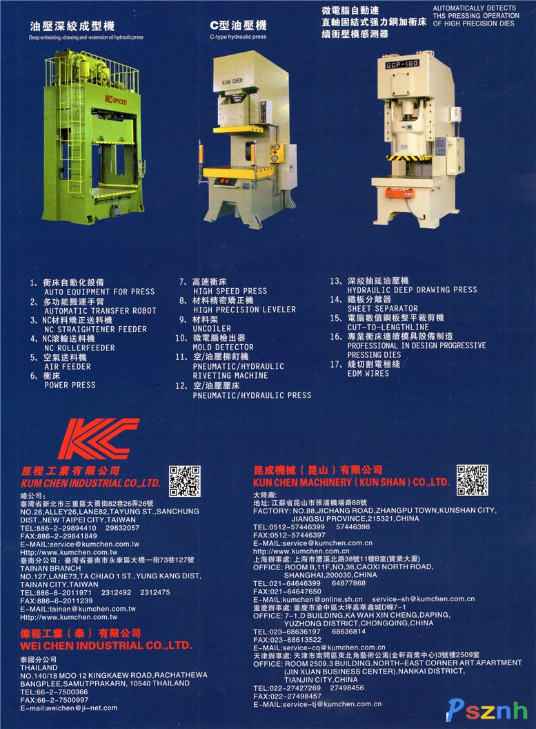 公司成立于1981年, 二十多年以來(lái), 昆程公司引進(jìn)了先進(jìn)的生產(chǎn)設(shè)備及專(zhuān)業(yè)的技術(shù)人才,注重每道工序的嚴(yán)謹(jǐn)品質(zhì)控制, 結(jié)合國(guó)外的先進(jìn)理念及技術(shù)全力于高品質(zhì)、高精度之沖壓自動(dòng)化設(shè)備及鉚釘機(jī)、油壓機(jī)的研發(fā)與生產(chǎn), 務(wù)使每一部機(jī)器都能達(dá)到最完美的效能, 從而為客戶(hù)發(fā)揮最高的工作效率。