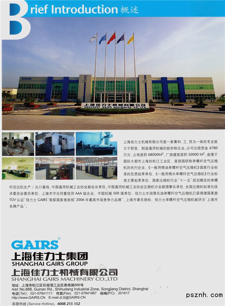 上海佳力士機(jī)械有限公司是一家集科、工、貿(mào)為一體的專業(yè)致力于研發(fā)、制造通用機(jī)械的股份制企業(yè)。公司注冊(cè)資金 6780萬元,占地面積68000M²,廠房建筑面積50000 M²,座落于國際大都市上海松江工業(yè)區(qū),是我國研制單螺桿空氣壓縮機(jī)的先行企業(yè)、《一般用噴油單螺桿空氣壓縮機(jī)》國家行業(yè)標(biāo)準(zhǔn)的負(fù)責(zé)起草單位、《一般用噴水單螺桿空氣壓縮機(jī)》行業(yè)標(biāo)準(zhǔn)主要起草單位,國家壓縮機(jī)行業(yè)“十一五”規(guī)劃確定的單螺桿空壓機(jī)生產(chǎn)/出口基地,中國通用機(jī)械工業(yè)協(xié)會(huì)副會(huì)長單位、中國通用機(jī)械工業(yè)協(xié)會(huì)壓縮機(jī)分會(huì)副理事長單位,全國壓縮機(jī)標(biāo)準(zhǔn)化技術(shù)委員會(huì)委員單位,全國守合同重信用企業(yè),中國機(jī)械500強(qiáng)單位;“佳力士GAIRS”榮獲國家商務(wù)部“2006年最具市場競爭力品牌”、上海市著名商標(biāo);佳力士單螺桿空氣壓縮機(jī)榮獲上海市名牌產(chǎn)品;佳力士水潤滑無油單螺桿空氣壓縮機(jī)獲得德國萊茵TÜV認(rèn)證。