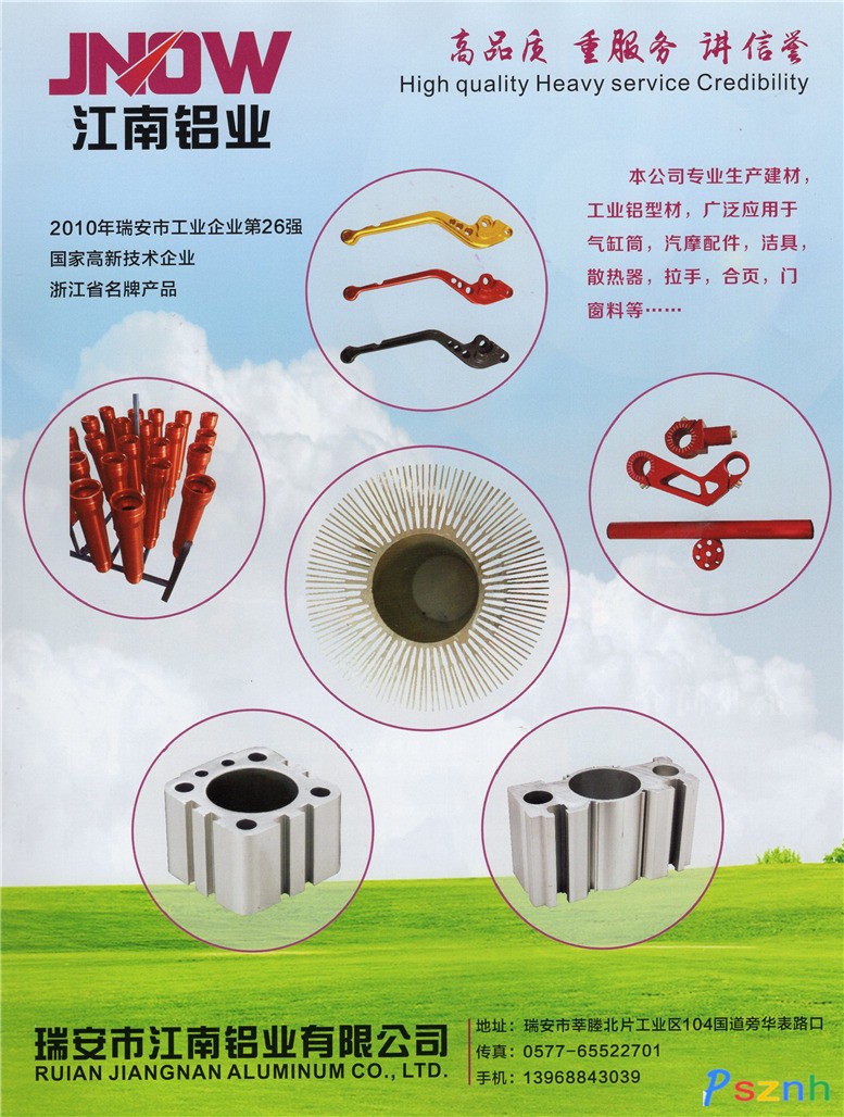 瑞安市江南鋁業(yè)有限公司創(chuàng)辦于1993年,是一家集工業(yè)鋁型材、建筑鋁型材的設計、研發(fā)、生產(chǎn)、銷售為一體的企業(yè)。廠區(qū)位于浙江省瑞安市莘塍鎮(zhèn)北片工業(yè)區(qū)104國道邊(華表路口),占地面積10000平方米。產(chǎn)品共計4萬多種,廣泛應用于汽摩配件、美發(fā)器材、衛(wèi)生潔具、旅游用品、箱包、燈具、家具拉手配件、卷門、室內(nèi)裝璜、裝飾、印刷機械、紡織器材等行業(yè),產(chǎn)品銷往全國各地以及東南亞等地區(qū)。