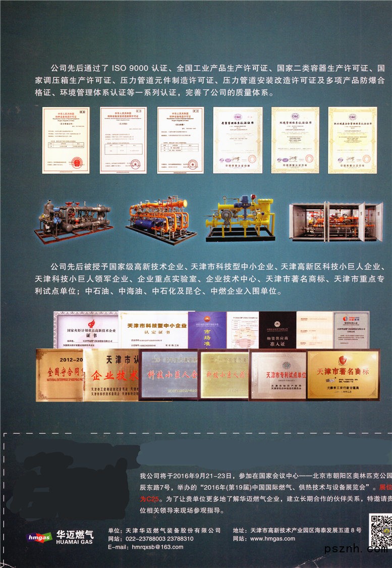 天津華邁燃?xì)庋b備股份有限公司(天津市華邁燃?xì)饧夹g(shù)發(fā)展有限公司)于2000年11月17日在天津市新技術(shù)產(chǎn)業(yè)園區(qū)成立,注冊(cè)資金4800萬(wàn)元;是一家以研發(fā)、生產(chǎn)燃?xì)饧捌渌茉?、環(huán)保裝備為主的高科技企業(yè)。經(jīng)過(guò)幾年的努力華邁公司已經(jīng)在液化氣氣化、多氣源摻混、CNG減壓裝置及LNG氣化站、燃?xì)庹{(diào)壓箱(站)及電站脫硝(氨站)等領(lǐng)域居于國(guó)內(nèi)領(lǐng)先水平。