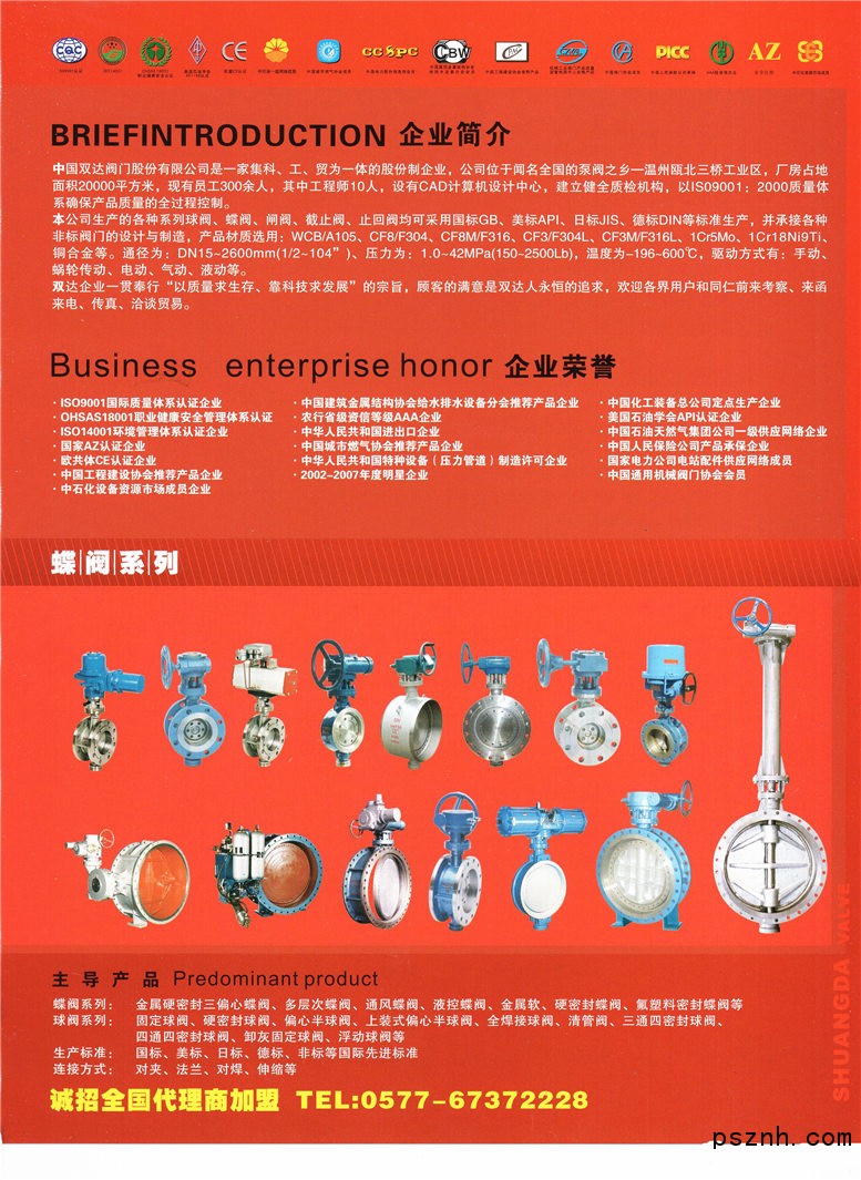 公司依靠科技創(chuàng)新,積極應(yīng)用新技術(shù)、新材料、新工藝,研制、開發(fā)、制造高質(zhì)量的閥門精品,產(chǎn)品廣泛應(yīng)用于電力系統(tǒng)、石油、化工、冶金、采礦、醫(yī)藥等行業(yè);閥門產(chǎn)品以卓越的品質(zhì)在全國各地享有盛譽(yù),并在全國各地設(shè)立銷售辦事處。以領(lǐng)先的科技與管理帶給您質(zhì)量的保證,以良好的信譽(yù)報(bào)答廣大用戶對(duì)雙達(dá)閥門系列的厚愛。秉承“一切為了用戶滿意”的經(jīng)營(yíng)理念,將不斷應(yīng)用新技術(shù)、新工藝、新材料、積極開發(fā)新品種,提高質(zhì)量,憑借本公司雄厚的技術(shù)力量和專業(yè)化生產(chǎn)的分工優(yōu)勢(shì),為廣大用戶提供更優(yōu)質(zhì)的閥門產(chǎn)品和更完善的售后服務(wù),為建立現(xiàn)代化閥門企業(yè)而努力奮斗。