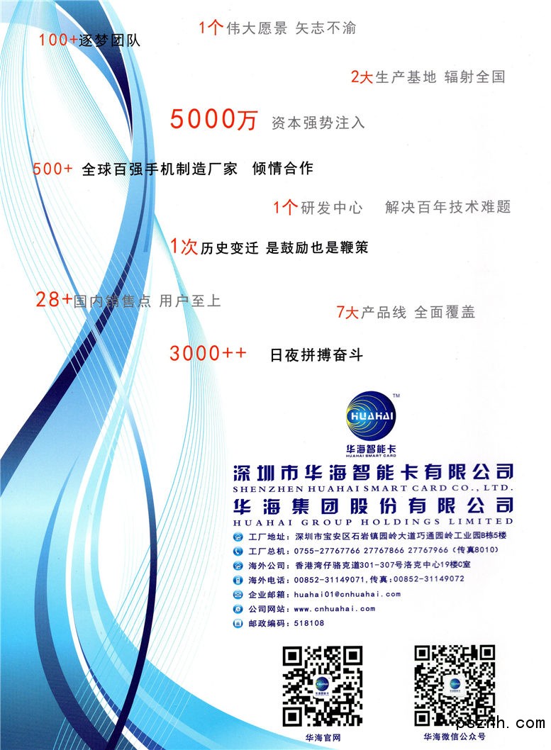 深圳市華海智能卡有限公司充分發(fā)揮地處中國(guó)深圳,毗鄰港澳的優(yōu)勢(shì),立足華南,服務(wù)全國(guó),輻射全球。公司憑借人性化的服務(wù)、專業(yè)的技術(shù)、過(guò)硬的品質(zhì)、良好的信譽(yù)、合理的價(jià)格及完善的售后服務(wù)系統(tǒng),贏得了海內(nèi)外廣大用戶的信賴與支持。截至目前,公司已經(jīng)累計(jì)為國(guó)內(nèi)外用戶提供了數(shù)十億枚的PVC、RFID產(chǎn)品,并廣泛應(yīng)用在安防、交通、旅游、防偽、金融等各個(gè)領(lǐng)域,并成功進(jìn)駐美國(guó)、日本、柬埔寨、馬來(lái)西亞、新加坡、俄羅斯、烏克蘭、德國(guó)、法國(guó)、英國(guó)、斯洛伐克、喀麥隆、科摩羅、吉布、也門(mén)、伊拉克、南非等100多個(gè)國(guó)家和地區(qū)。公司與世界各大半導(dǎo)體公司如NXP founded by Philips、EM、TI、ST、Impinj、ATMEL、法國(guó)INSIDE、英國(guó)JEWEL、以及國(guó)內(nèi)的復(fù)旦微電子、華虹集成電路等廠商建立了重要合作伙伴關(guān)系。在國(guó)內(nèi)外知名項(xiàng)目如:湖南省醫(yī)保卡、國(guó)家電網(wǎng)的智能標(biāo)簽、地鐵(輕軌)、大型城市一卡通、mcdonalds(麥當(dāng)勞)的積分系統(tǒng)、華為、美國(guó)T-Mobile、奧迪汽車、中國(guó)煙草、可口可樂(lè)、圖書(shū)館領(lǐng)域有著成功的應(yīng)用案例,為RFID產(chǎn)業(yè)在全球的發(fā)展中發(fā)揮了積極作用。