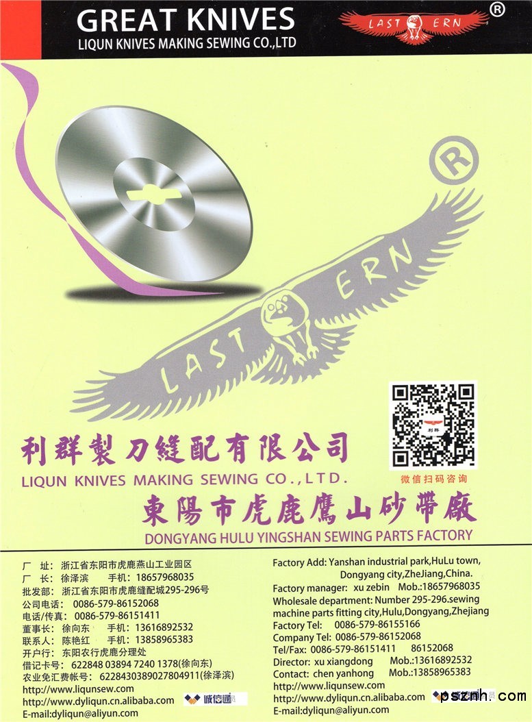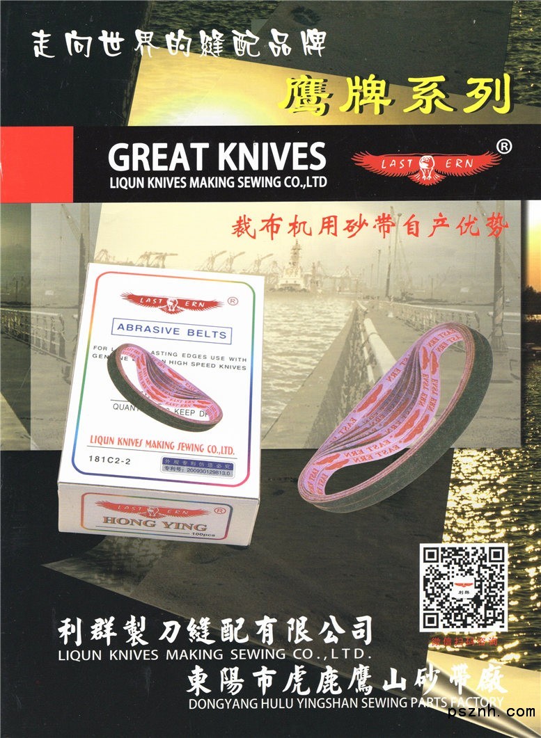 東陽市利群制刀縫配有限公司,早1998年在中國(guó)最大的縫紉配件集散中心浙江東陽虎鹿縫配城設(shè)立了公司門市部。經(jīng)過多年的艱苦創(chuàng)業(yè)和不懈努力,現(xiàn)已經(jīng)發(fā)展成為集開發(fā)、生產(chǎn)、銷售為一體的專業(yè)生產(chǎn)裁布機(jī)用砂帶、刀片等縫配產(chǎn)品企業(yè)。公司自成立以來一直注重企業(yè)文化品牌價(jià)值,現(xiàn)已擁有多個(gè)裁布機(jī)砂帶的知名品牌,其" 鷹牌"更為國(guó)內(nèi)外許多商家單位使用的指定品牌,同時(shí)還配套了產(chǎn)品的各種專利、防偽標(biāo)等。公司所生產(chǎn)的裁布機(jī)砂帶質(zhì)量上乘,性能可靠,在市場(chǎng)上享有廣泛的知名度和公司卓越的聲譽(yù)。