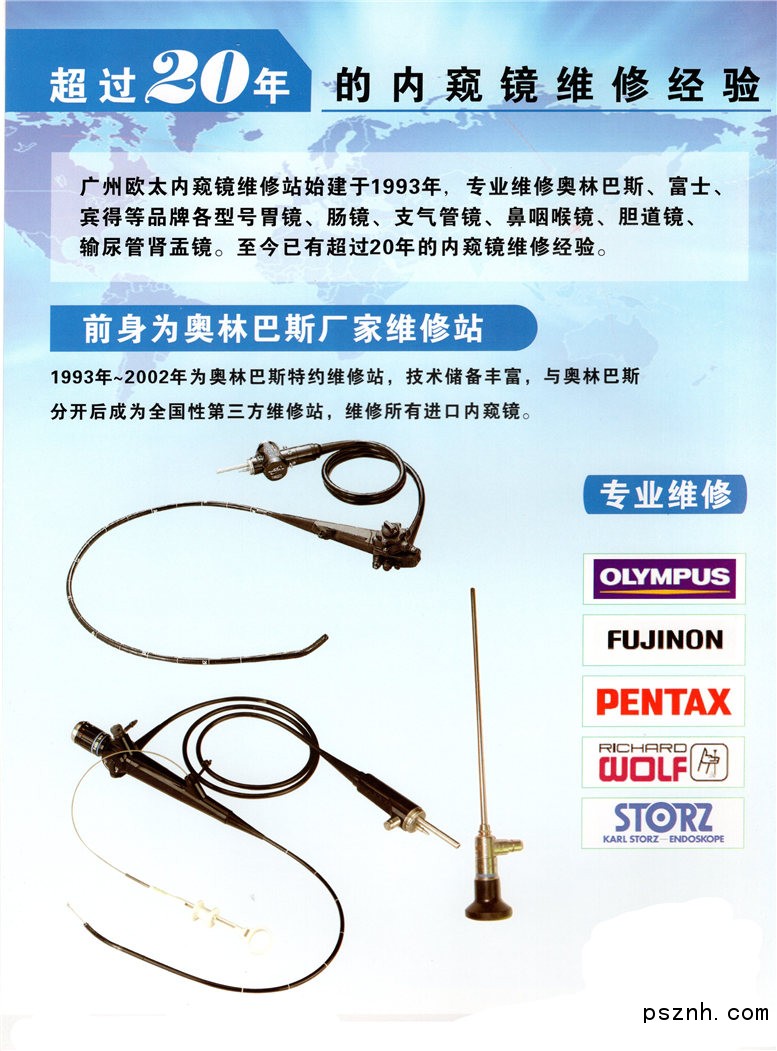 廣州市歐太貿(mào)易有限公司始建于1993年,1993年~2002年為奧林巴斯特約維修站,2002年后與奧林巴斯分開后成為第三方維修站,專業(yè)維修奧林巴斯、富士能、賓得等品牌各型號胃鏡、腸鏡、支氣管鏡、鼻咽喉鏡、膽道鏡。20年來為全國各省上萬客戶進(jìn)行了內(nèi)窺鏡維修,目前業(yè)務(wù)范圍遍布中國內(nèi)地的三十一個省市自治區(qū),是中國醫(yī)用內(nèi)鏡行業(yè)首屈一指的第三方維修站。