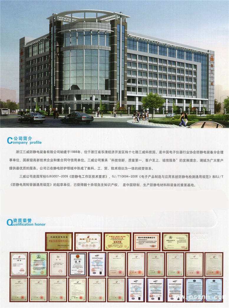 浙江三威防靜電裝備有限公司始建于1988年,已在靜電環(huán)境防護領域中形成集科、工、貿(mào)、工程設計和技術培訓為一體的專業(yè)公司,是國家級高新技術企業(yè)和重合同守信用單位。公司生產(chǎn)的“三威”“3W”防靜電系列產(chǎn)品按照IEC61340-5-1和ANSI/ESD-20.20的國際標準和國軍標的技術標準生產(chǎn),已通過并嚴格執(zhí)行ISO9001:2008質(zhì)量管理體系、ISO14001:2004 環(huán)境管理體系,產(chǎn)品材料經(jīng)SGS檢測, 符合ROHS標準。生產(chǎn)的系列產(chǎn)品:SMT防靜電收集箱(架)、防靜電周轉車、防靜電椅、防靜電周轉箱、托盤、元件盒、人體防護、建筑防護、生產(chǎn)工具、檢測檢驗設備、凈化抹布等凈化類產(chǎn)品。公司研發(fā)的防靜電SPU鞋、拖鞋,已投入批量生產(chǎn)。產(chǎn)品榮獲國家“防靜電中華精品”、“防靜電優(yōu)質(zhì)產(chǎn)品”等榮譽證書。