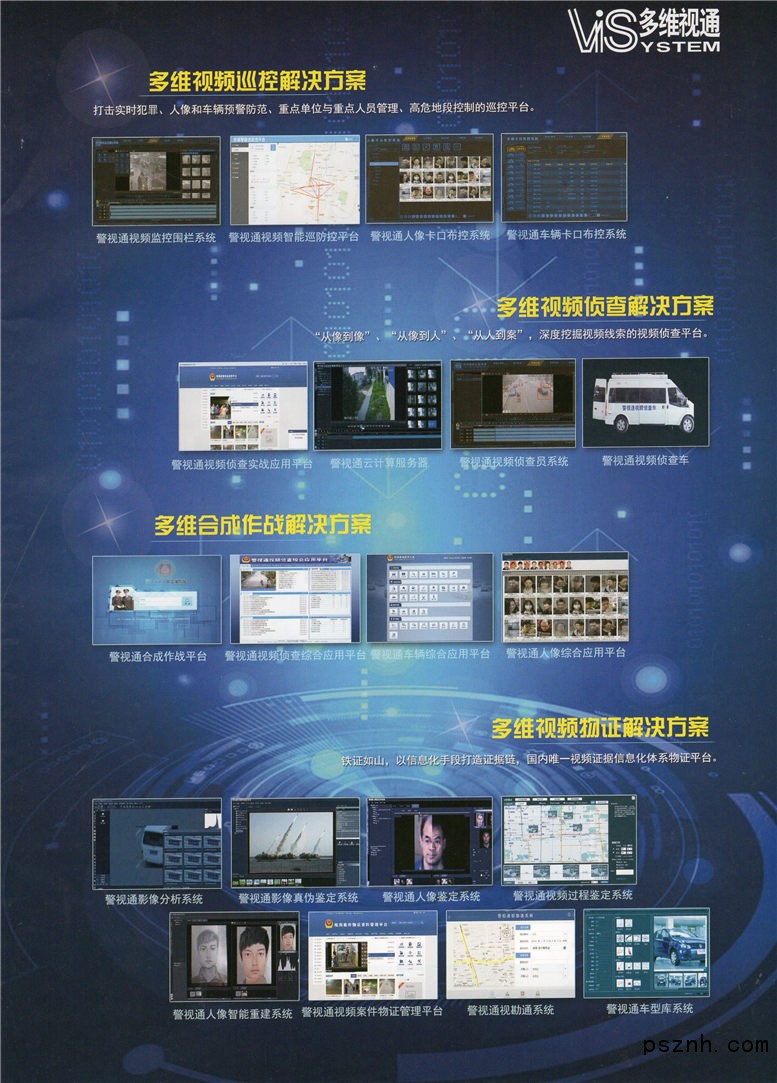 多維視通公司為公安系統(tǒng)量身打造的專(zhuān)業(yè)化系列產(chǎn)品——“警視通”,已經(jīng)成為刑偵行業(yè)的一個(gè)標(biāo)志性品牌。產(chǎn)品包括支持視頻偵查作戰(zhàn)的《警視通影像分析系統(tǒng)》、《警視通視頻偵查分析檢索系統(tǒng)》、《警視通視頻案件管理系統(tǒng)》、《警視通視頻偵查研判指揮系統(tǒng)》、《警視通視頻偵查員系統(tǒng)》,以及《警用DNA分析鑒定系統(tǒng)》、《數(shù)字圖像篡改鑒定系統(tǒng)》、《工具痕跡自動(dòng)比對(duì)系統(tǒng)》等多個(gè)產(chǎn)品。其中,《警視通影像分析系統(tǒng)》是公司、中科院和物證鑒定中心在“國(guó)家科技支撐計(jì)劃”課題成果基礎(chǔ)上,為公安系統(tǒng)視聽(tīng)技術(shù)行業(yè)定制的影像分析平臺(tái),已成為刑偵影像處理、分析必備的專(zhuān)業(yè)設(shè)備。