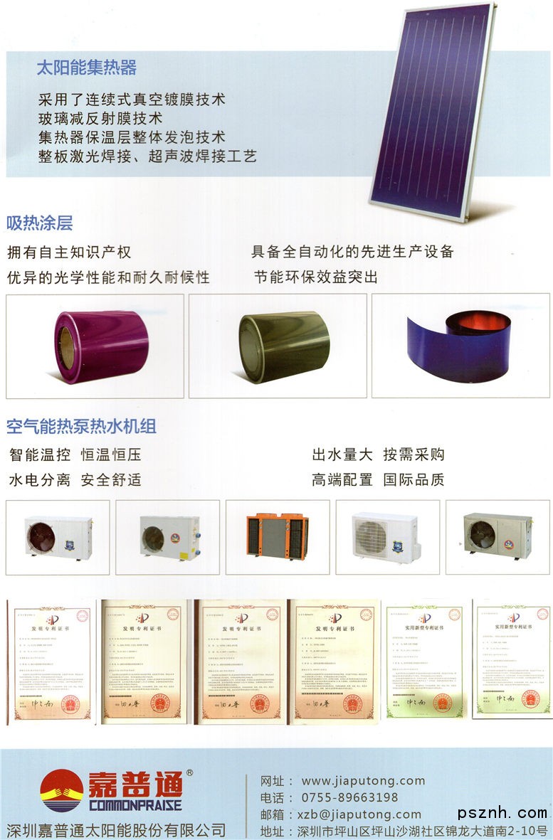 歷經(jīng)20年的持續(xù)穩(wěn)健發(fā)展,嘉普通形成了以太陽能光選擇性吸收層、平板太陽能集熱器、太陽能空氣集熱器、儲(換)熱水箱等太陽能熱利用設(shè)備與部品部件的研發(fā)制造及太陽能供熱采暖系統(tǒng)集成為主的產(chǎn)業(yè)格局,憑借豐富的研發(fā)、設(shè)計(jì)、施工與調(diào)試經(jīng)驗(yàn),積累與沉淀了數(shù)百萬平米的太陽能供熱采暖系統(tǒng),在全球新能源產(chǎn)業(yè)版圖中確立了獨(dú)特的競爭優(yōu)勢。終端用戶涵蓋住宅小區(qū)、工廠、酒店、學(xué)校、醫(yī)院、機(jī)關(guān)單位等,同時(shí),和歐洲、北美洲、澳大利亞等發(fā)達(dá)國家和地區(qū)的多家領(lǐng)先企業(yè)確立了穩(wěn)定的供貨關(guān)系。