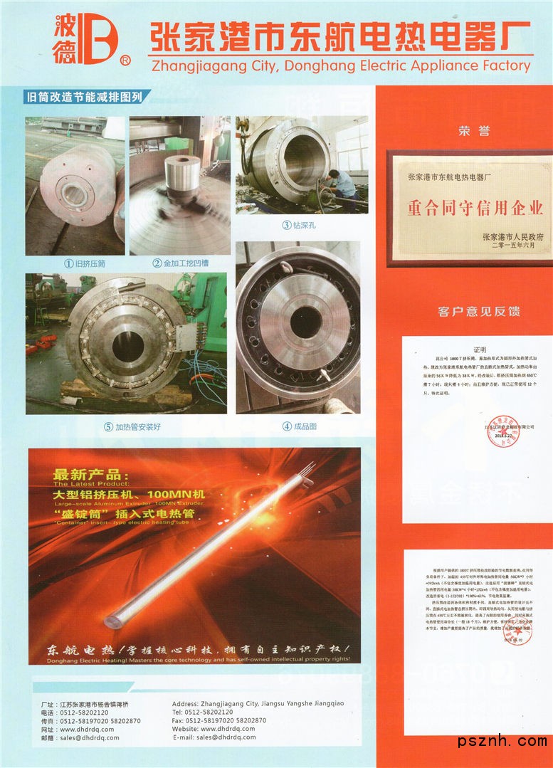 張家港市東航電熱電器廠成立于1971年,是研制各種金屬管狀電熱元件產(chǎn)品的制造商。“波德”牌商標于93年注冊,專為工業(yè)用電加熱管,產(chǎn)品質量符合JB/T2379-93部頒標準(本廠是93標準起草單位之一)?,F(xiàn)在,“波德”牌產(chǎn)品被中國鋁加工工業(yè)廣泛采用,從630T-10000T以上大中型國內外銅、鋁型材擠壓機,盛錠筒(擠壓筒)配套加熱用。如:美國薩頓、日本宇部、意大利達涅利、德國西馬克、薩帕鋁(江陰)公司、臺灣建華、源上、梅瑞、新泳、誼昌、聲傑 等。國內如:太原重型機械、西安重型所、沈陽新鑫模具、中冶陜壓、廣東佛山明晟機械、佛山業(yè)精機械、佛山南海金瀝機械、佛山興橋重型、佛山新頌星、無錫源昌、無錫市威特機械等,有五家公司近四年來新開發(fā)的短行程擠壓機配用“波德”牌直插式節(jié)能電熱管已隨機銷往世界各地。