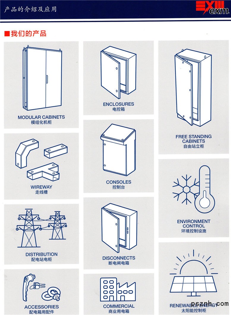 義斯盟箱柜制造(常熟)有限公司EXM自1975年便開始從事電氣箱柜的生產(chǎn)。在加拿大、美國、臺灣都設(shè)有工廠。高質(zhì)量的產(chǎn)品就是我們給客戶的承諾。EXM制造各類不同IP等級的箱柜,廣泛應用于工業(yè)和商業(yè)領(lǐng)域,同時也制造控制臺、電腦用機柜、電氣設(shè)備、模塊化機柜和零部件等。我們的箱柜擁有獨特的先進設(shè)計,有一些更是在行業(yè)中獨樹一幟。箱體都有UL和CSA認證。箱體都是由全自動化的生產(chǎn)設(shè)備生產(chǎn)。EXM在北美有很好的市場占有率,西門子,ABB,wesco,Bosch,施耐德等著名企業(yè)都是我們的客戶。為了推廣EXM產(chǎn)品,也使EXM產(chǎn)品能更好的為大眾服務(wù),我們在江蘇常熟設(shè)立了新的工廠。我司擁有一個自主研發(fā)的BOXCAD自主繪圖系統(tǒng),運用Boxcad自主繪圖系統(tǒng)可以使我們的箱體制造流程更快速、更高效,也可以定制公制系列模塊化箱柜上的組件。EXM 能夠制造特殊尺寸和特殊顏色的箱柜。我們能在箱柜上打孔、安裝螺母、 壁掛片、視窗等一系列零配件。運用BoxCAD自主繪圖系統(tǒng)的目的就是減少運輸時間,以及圖紙的來回確認時間。不再需要CAD繪圖軟件,所有繪圖都能夠在BoxCAD里實現(xiàn),您只需訪問來定制您自己的箱柜。