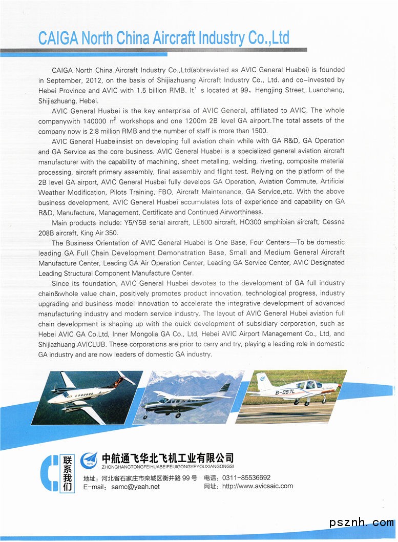 航空工業(yè)通飛華北公司是中國航空工業(yè)集團公司所屬成員單位,是航空工業(yè)通飛公司的核心骨干企業(yè),是國內(nèi)領(lǐng)先的通用飛機專業(yè)化制造企業(yè)。