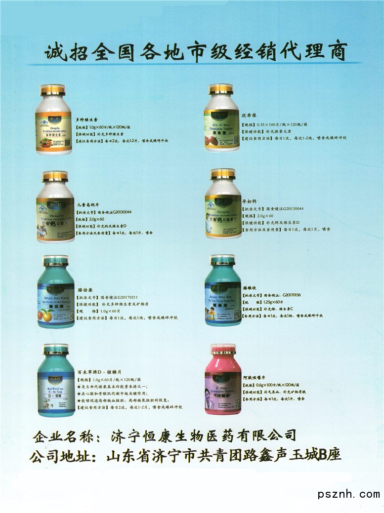 恒康生物醫(yī)藥現(xiàn)擁有多條現(xiàn)代化片劑、顆粒、粉劑、軟膠囊GMP認(rèn)證生產(chǎn)線(xiàn)和多個(gè)國(guó)食健字批準(zhǔn)文號(hào)、SC等;公司根據(jù)市場(chǎng)需要研制生產(chǎn)的恒佳鈣D片(補(bǔ)鈣)系列、膳維欣(補(bǔ)鋅)系列、易雪康(補(bǔ)血)系列、膳倍康(維生素)系列、瑪咖(提高免疫力)系列、螺旋藻系列、泡騰片系列、蛋白質(zhì)、氨基酸、顆粒沖劑、軟膠囊等100多個(gè)系列產(chǎn)品,具有含量高、易吸收、價(jià)格低廉等特點(diǎn),得到經(jīng)銷(xiāo)商和消費(fèi)者的一致認(rèn)可。