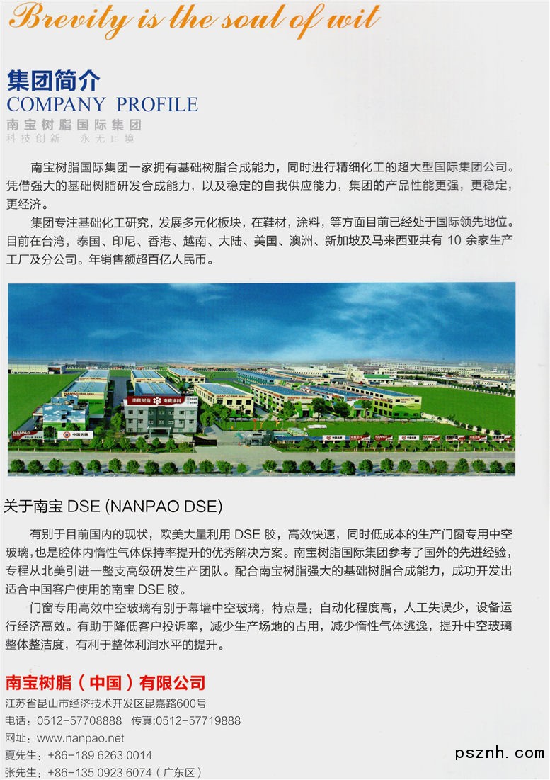 南寶樹脂(中國(guó))有限公司位于江蘇省昆山市經(jīng)濟(jì)技術(shù)開發(fā)區(qū),成立于1996年,公司注冊(cè)資金1000萬美元, 投資總額3000萬美元。主要產(chǎn)品有:1.建筑裝飾用涂料(水泥漆);2.工業(yè)涂料,特殊涂料; 3.工業(yè)用膠水; 4.熱硬化性粉體涂料5. 電子用化學(xué)品等。公司從德國(guó)、瑞士、日本、臺(tái)灣引進(jìn)一系列先進(jìn)的生產(chǎn)、品管設(shè)備。其中,有從德國(guó)進(jìn)口水性涂裝設(shè)備---超高速攪拌機(jī),它能確保產(chǎn)品處于最佳狀態(tài);有從世界上最大最好的粉體設(shè)備制造商瑞士BUSS進(jìn)口最精密機(jī)器, 等等。
