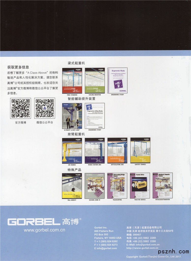 GORBEL高博可以提供多種高架物料輸送方案,其組合式起重機系列包括:組合式自立起重機、組合式懸掛起重機、單軌起重機和組合式旋臂起重機(立柱式/壁掛式)。我們還生產更為靈活精準的智能型提升裝置G-Force™、Easy Arm™。同時,GORBEL高博也是高性能手動和電動工字鋼旋臂起重機的主要生產商。2013-2014年間,高博持續(xù)創(chuàng)新,不斷完善生產線,又推出了鋁制主梁組合式起重機和G/GR系列環(huán)鏈電動葫蘆等產品。