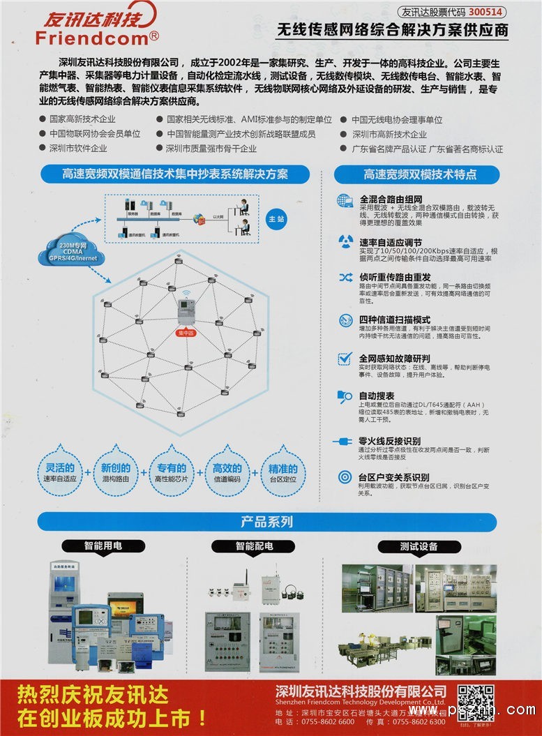 多年來,友訊達(dá)一直秉承“專業(yè)敬業(yè),創(chuàng)造卓越”的企業(yè)準(zhǔn)則,潛心于拓展無線電數(shù)傳領(lǐng)域,已成功推出了具有獨(dú)立知識(shí)產(chǎn)權(quán)、符合中國(guó)國(guó)情的FC系列無線數(shù)傳產(chǎn)品,其中FC-201、FC-221、FC-601、FC-621等系列民用無線控制裝置已通過國(guó)家無線電管理機(jī)構(gòu)的核準(zhǔn),并實(shí)現(xiàn)規(guī)?;a(chǎn),年產(chǎn)量可達(dá)1000萬臺(tái)(套)。我公司按國(guó)網(wǎng)標(biāo)準(zhǔn)生產(chǎn)的集中器、I型及II型采集器等FC-621系列電力用戶用電信息采集設(shè)備已經(jīng)通過國(guó)網(wǎng)計(jì)量中心的委托全性能試驗(yàn),完全符合國(guó)家電網(wǎng)最新要求以及其他相關(guān)行業(yè)標(biāo)準(zhǔn)。