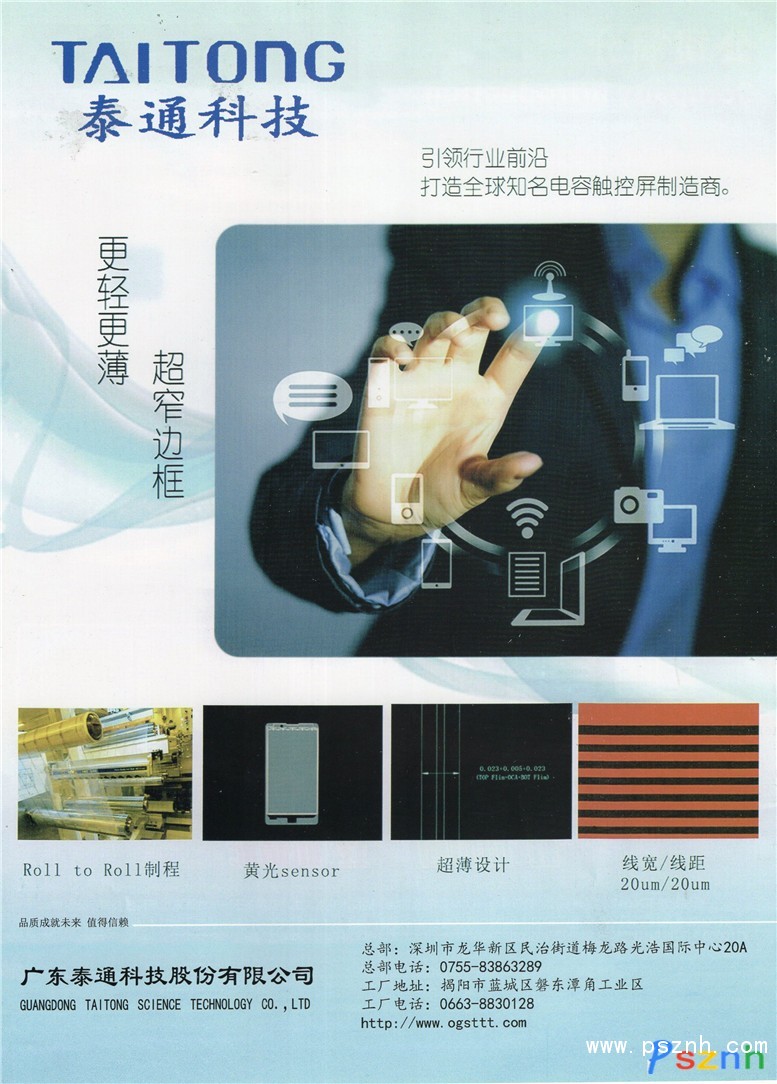 廣東泰通科技股份有限公司是專業(yè)從事電容觸摸屏(Touch Panel/Window)研發(fā)、制造、銷售于一體的高科技企業(yè)。公司于2012年10月8日成立,位于廣東省揭陽市經(jīng)濟技術開發(fā)區(qū),注冊資本6000萬元,總投資額3億元,占地面積150畝;主營產(chǎn)品為膜(Film)結構投射式電容觸控屏(CTP)及模組,年產(chǎn)能3600萬片。產(chǎn)品廣泛應用于手機(Mobile)、衛(wèi)星導航系統(tǒng)(GPS)、汽車電子、數(shù)位相機等中小尺寸可攜式電子產(chǎn)品用ITO觸控面板(Touch Panel/Window),以及筆記本電腦(Note Book)、工業(yè)控制產(chǎn)品、家用電器等大尺寸電子產(chǎn)品觸控面板領域。 公司擁有標準的百級無塵生產(chǎn)車間(符合Fed-std-209E潔凈室標準),并從臺灣、日本和法國等地引進國際先進的現(xiàn)代化的全自動生產(chǎn)設備,立足高起點,采用了代表觸摸屏行業(yè)未來發(fā)展趨勢的卷對卷(Roll to Roll)的黃光制程工藝,可實現(xiàn)超窄邊框、更高精度和更高良率的產(chǎn)品生產(chǎn),為廣大客戶提供更好的服務。