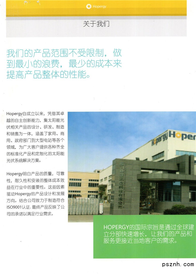 廈門華譜光電科技有限公司是太陽能支架、太陽能發(fā)電、鋁合金支架等產(chǎn)品專業(yè)生產(chǎn)加工的公司,擁有完整、科學的質(zhì)量管理體系。廈門華譜光電科技有限公司的誠信、實力和產(chǎn)品質(zhì)量獲得業(yè)界的認可。歡迎各界朋友蒞臨參觀、指導和業(yè)務洽談。 Hopergy自成立以來,憑借其卓越的自主創(chuàng)新能力,集太陽能光伏相關(guān)產(chǎn)品的設計、研發(fā)、制造和銷售為一體,涵蓋了家用、商用、政府部門到大型電站級等各個領(lǐng)域,為廣大客戶提供種類齊全的標準化產(chǎn)品和定制化的太陽能光伏系統(tǒng)解決方案。 基于業(yè)內(nèi)知名的品牌、優(yōu)質(zhì)的產(chǎn)品、有競爭力的價格和卓越的服務品質(zhì),Hopergy一直與全球的合作企業(yè)建立一種長期互惠的戰(zhàn)略合作伙伴關(guān)系,致力于滿足并超出客戶的預期,宗旨是把自己努力打造為一家世界領(lǐng)先級的太陽能光伏系統(tǒng)集成方案供應商。 我們的目標是在給客戶不斷創(chuàng)造價值的基礎(chǔ)上提供物美價廉的可再生能源產(chǎn)品和解決方案,為推進綠色能源在世界范圍內(nèi)的普及做出相應貢獻。我們期待成為您最值得信賴的專業(yè)從事太陽能光伏系統(tǒng)解決方案的合格供應商。