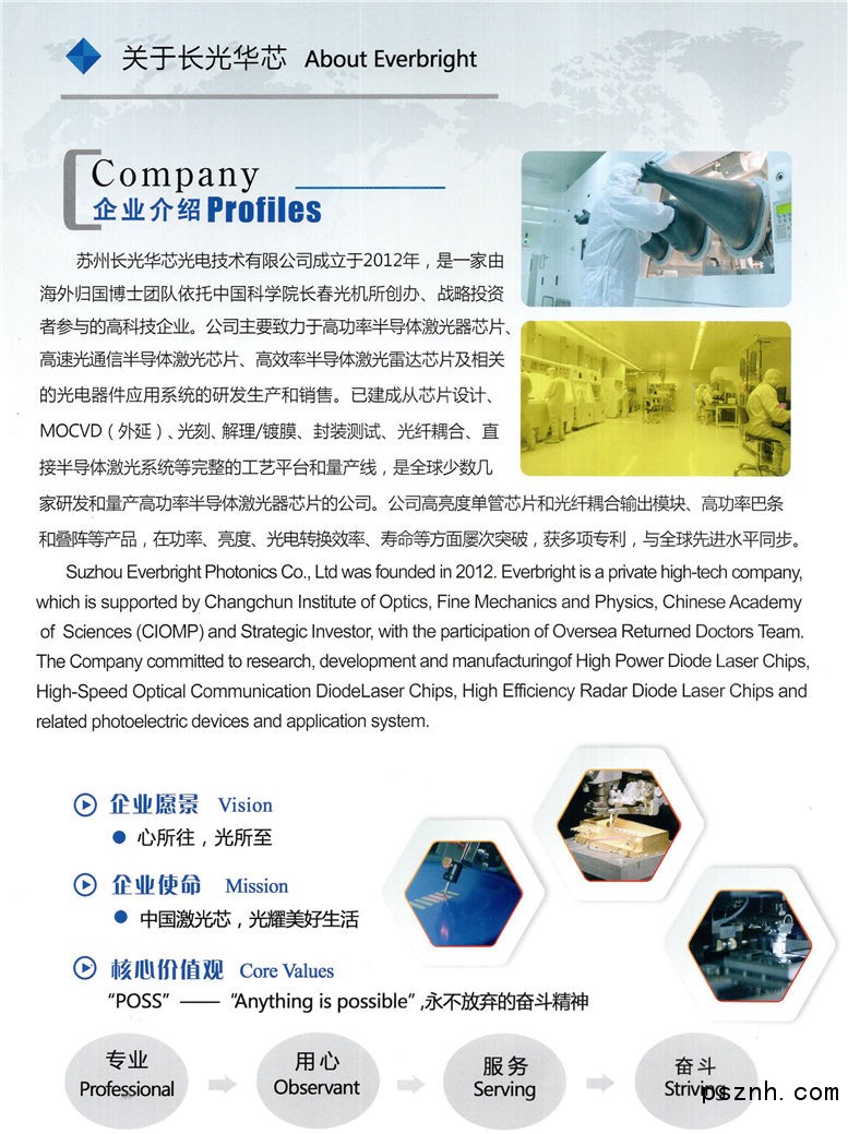 蘇州長光華芯光電的愿景是成為國際一流的半導(dǎo)體光電研發(fā)平臺(tái)和產(chǎn)業(yè)化公司, 致力于向國內(nèi)外客戶提供高性能的產(chǎn)品及解決方案, 與客戶共同開拓光電技術(shù)的應(yīng)用。“以技術(shù)占市場、以服務(wù)求發(fā)展、以質(zhì)量樹信譽(yù)”是公司奉行的方針及承諾。我們始終堅(jiān)持誠信經(jīng)營,讓員工和企業(yè)共同成長,創(chuàng)造更加輝煌的明天,成為“激光動(dòng)力之源”是公司的使命。